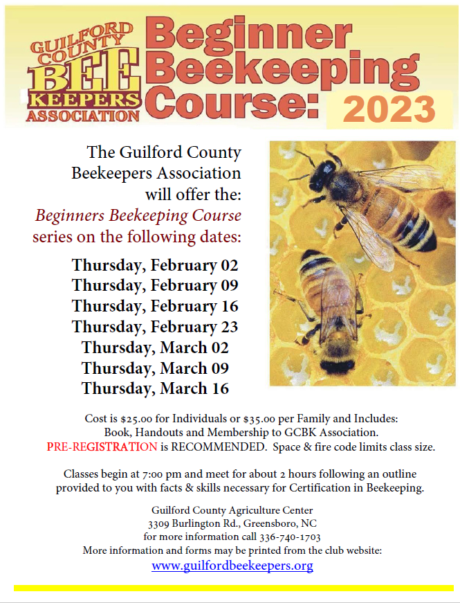 The Guilford County Beekeepers Association will offer the Beginner Beekeeping Course starting in February 2023. See the flyer below for more information. Visit the Guilford Beekeepers website.