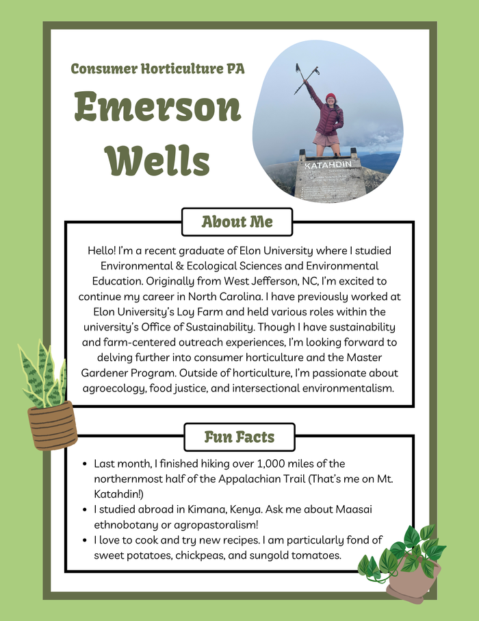 Hello! I'm a recent graduate of Elon University where I studied Environmental & Ecological Sciences and Environmental Education. Originally from West Jefferson, NC, I'm excited to continue my career in North Carolina. I have previously worked at Elon University's Loy Farm and held various roles within the university's Office of Sustainability. Though I have sustainability and farm-centered outreach experiences, I'm looking forward to delving further into consumer horticulture and the Master Gardener Program. Outside of horticulture. I'm passionate about agroecology, food justice, and intersectional environmentalism.Fun Facts